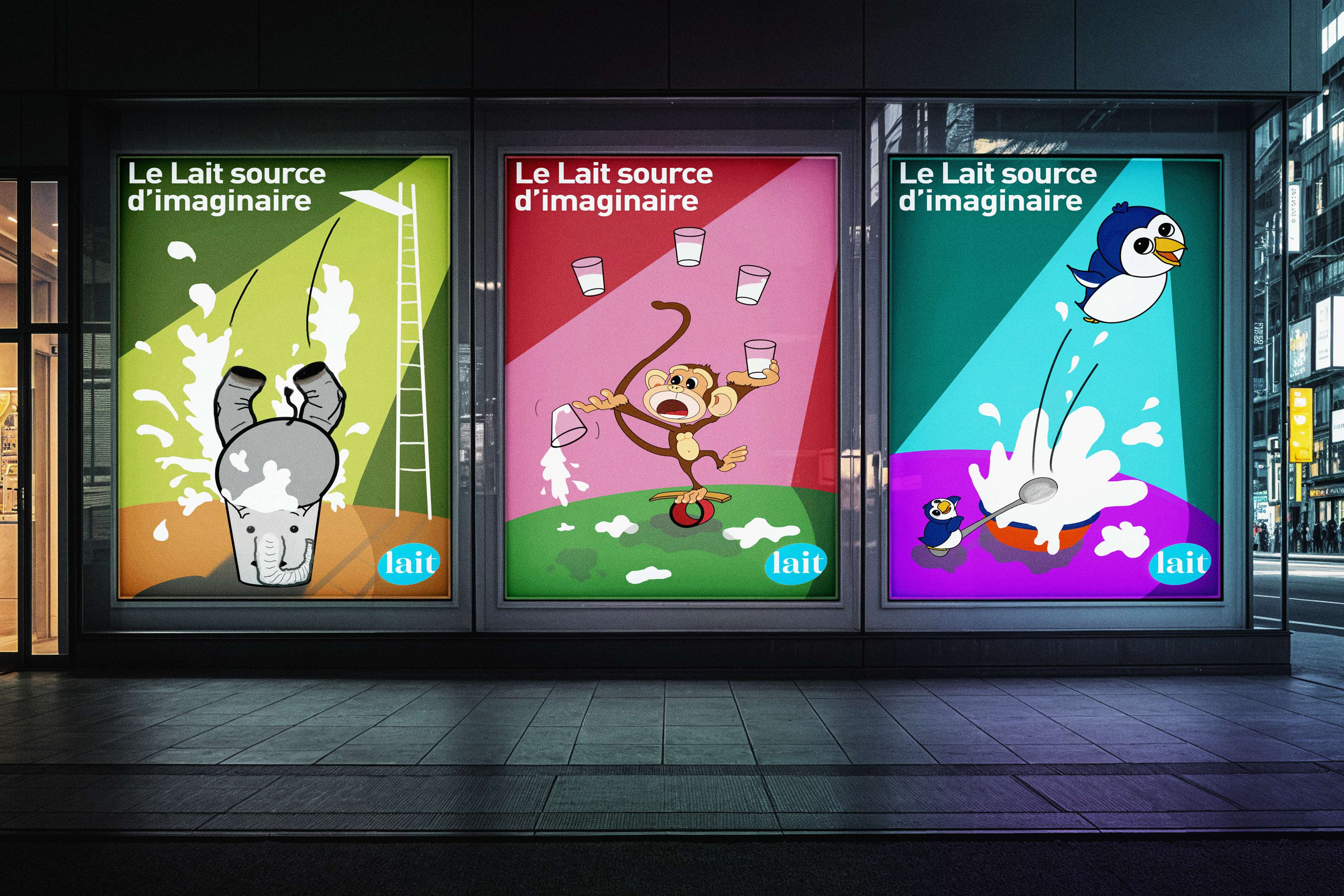 Mandat : Concevoir une série de trois affiches pour la campagne publicitaire « Le Lait source d'imaginaire » à l'aide d'illustrations.
